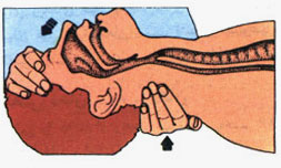 ۱. یک دست خود را زیر گردن و دست دیگر را روى پیشانى مصدوم قرار دهید و سر مصدوم را به عقب خم نمائید. این کار باعث کشیدگى سر و گردن شده و راه تنفس را باز مىکند.