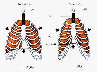 فلشهاى سیاه نشاندهندهٔ جهت حرکت قفسهٔ سینه و دیافراگم در حین تنفس است.فلشهاى سفید نشاندهندهٔ مسیر عبور هوا در حین تنفس است.