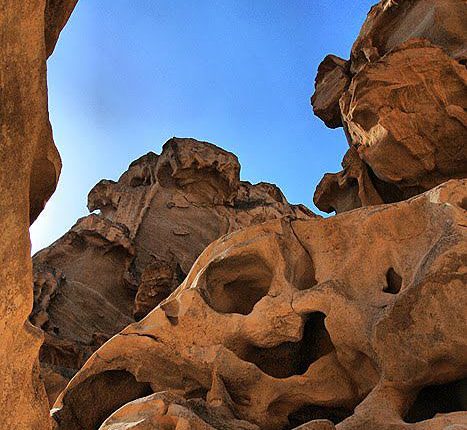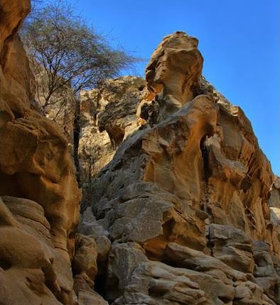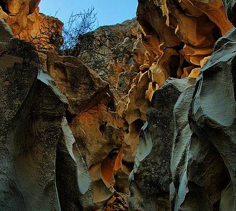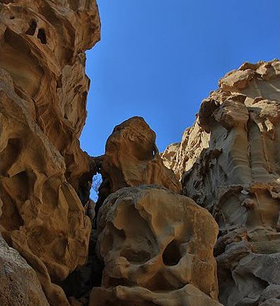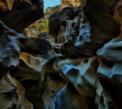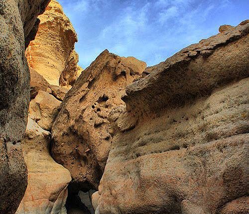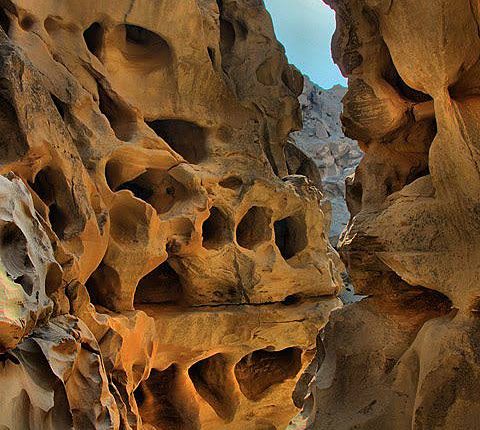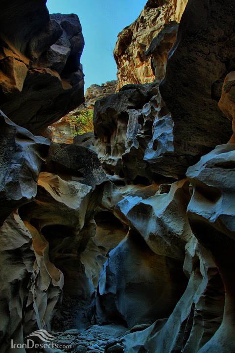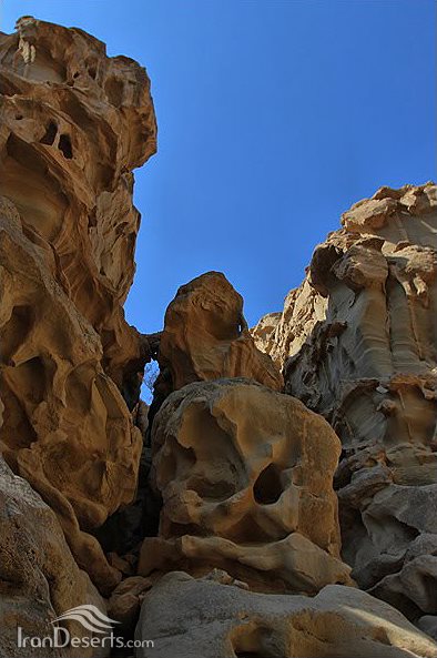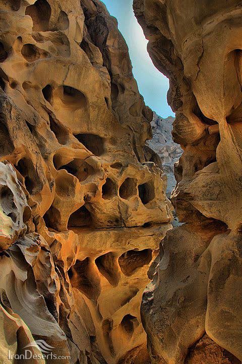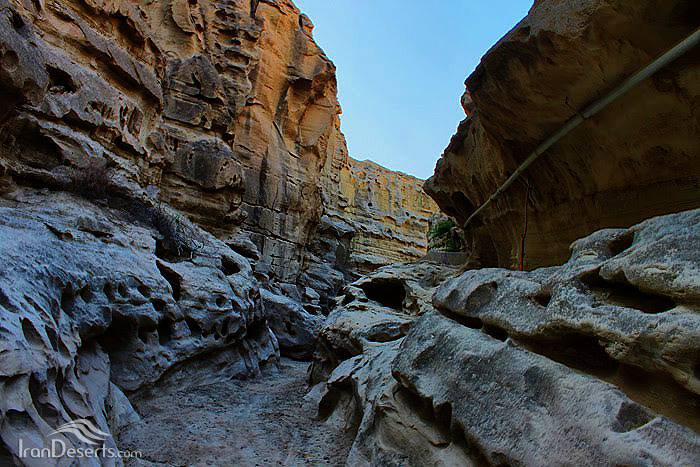 حفرهها و شیارهاى فراوانى در دیوارههیا تنگه مشاهده مىشوند که شکلهاى نیمکروى، قاشقى و طاقچهاى دارند و عناصر اصلى زیبایى این تنگه محسوب مىشوند. شیارهاى خطى و طاقچهاى در بسیارى از نقاط بهصورت موازى دیده مىشوند و دلیل بروز این حالت، انحلال و فرسایش در میان لایههاى رسى و مارنى است که نسبت به ماسه سنگ آهکى (جنس اصلى دیوارهها) فرسایشپذیرى زیادى دارند. همچنین وجود رس رس و مارن در این لایهها و از بین رفتن آنها در اثر فرسایش، شکلهاى کروى و قاشقى را بر دیوارهها پدید آورده است. حرکت سریع و تخریبى آب در زمان بروز سیلابها، عامل دیگرى در فرسایش لایهها و ایجاد شکلهاى تیغهاى و گوهاى با لبههاى صیقلى است.