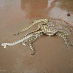 سطح بالایی بدن به رنگ زرد یا زیتونی یا خاکستری و سطح زیرین آن سفید رنگ ، دارای 45 تا 55 خال باریک عرضی به رنگ خاکستری تیره یا سیاه و در سطوح جانبی خالها باریک تر می شود ، در نوزادان ناحیه سر سیاه رنگ و در بالغین به رنگ زیتونی خاکستری با علائم یا بدون علائم هلالی شکل .