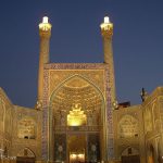 اگر شکوه رنگ و عظمت صحنه سر در و گنبد قبلا خیره کننده بود، تکرار خیره کننده بود، تکرار خوش آهنگ عناصر ساختمانی، طاقنماهای متقارن، ایوانهای متعادل، آرامش حوض بزرگ وضو و اثر یکدست کننده رنگی فراگیر که بر همه جا گسترده، گنبد حالتی برازنده و گیرا و اندکی پیازی شکل، بر ساقه بلندی قرار گرفته، ساده و دارای طرحی بسیار روشن و گویاست، بی آنکه هیچگونه پشتبند یا حمال داشته باشد.