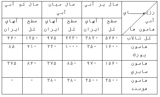 جدول : برآورد مساحت هامون ها در رژیم های پرآبی ، میان آبی و کم آبی به کیلومتر مربع .