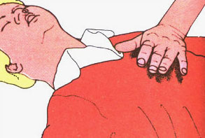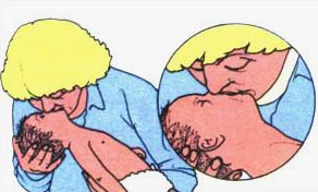 ۱. دهان خود را باز کنید و لب‌هاى خود را به دور دهان و بینى کودک بچسبانید و با سرعتى معادل بیست نفس در دقیقه با ملایمت به او نفس بدهید. پس از چهار تنفس اول ضربان قلب را آزمایش کنید.