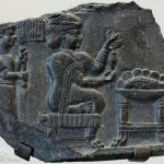 تصویر نمونه ای از نخ ریسی در ایران باستان را نشان می دهد. زنی با دستانی پوشیده از زیور آلات، به حالت غیر رسمی و چهار زانو در برابر میزی نشسته. او دوکنخ ریسی را که در بالا دارای فرمی گُل مانند است با دست چپ خود گرفته است. لباس تونیک مانند بدون آستینی به تن دارد و سرپوشی که بر شانه اش افتاده،موهای بلند او را نمایان ساخته. شخصی که در پشت ایستاده نیز لباسی با آستینی کوتاه به تن دارد. در این تصویر صندلی با پارچه ای پوشیده شده و در برابرمیزی که پایه های کوتاه و رویه ای ضخیم دارد، قرار گرفته. بر روی میزخوراکی از ماهی و شش -هفت عدد نان وجود دارد. به نظر می رسد زن از طبقه ی بالای اجتماعی باشد. در پشت سر او خدمتکاری مشغول باد زدن این زن است. این اثر در موزه ی لوور نگهداری می شود.جنس ماده ی این نقش برجسته نشان می دهد که این اثر متعلق به شوش و مربوط به قرن هفتم یا هشتم پیش از میلاد است.