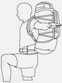 1- ابتدا تمامی بند شانه و کمربند کوله را شل کنید . کوله روی دوش بیاندازید ، شانه ها را بالا بیاندازید تا کوله پشتی بالاتر قرار بگیرد ، حال کمربند کوله پشتی را روی استخوان لگن خود تنظیم کنید مطابق شکل . کمر بند کوله سفت ببندید.