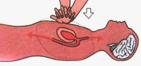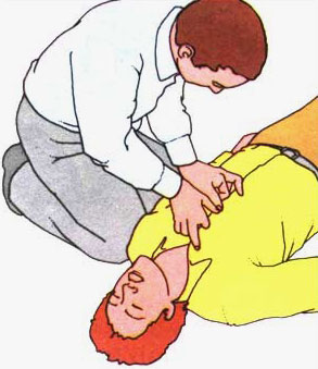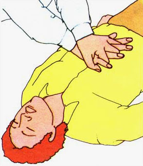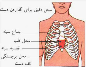 برجستگى کف دست را روى نیمهٔ پائینى استخوان جناغ سینه قرار دهید. انگشتان دست را باز کنید کف دست دیگر خود را روى این دست قرار دهید و انگشتان را درهم فرو ببرید.