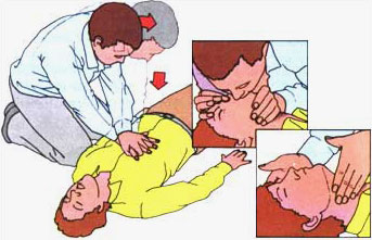 ۵. دوباره پانزده کمپرس و سپس به‌دنبال آن دو تنفس دهان به دهان، دقیقه اول پس از انجام اعمال فوق نبض را آزمایش کنید. و پس از آن هر سه دقیقه یکبار مجدداً نبض را امتحان کنید.